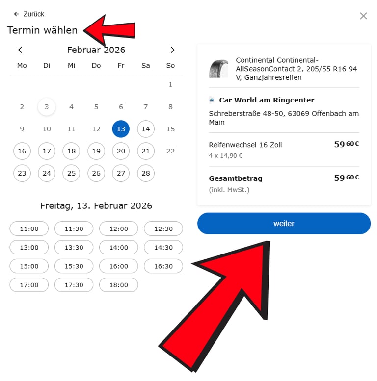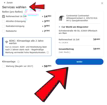 5.Buchen Sie weitere Services wie die Entsorgung ihrer Altreifen und drücken Sie auf weiter um fortzufahren